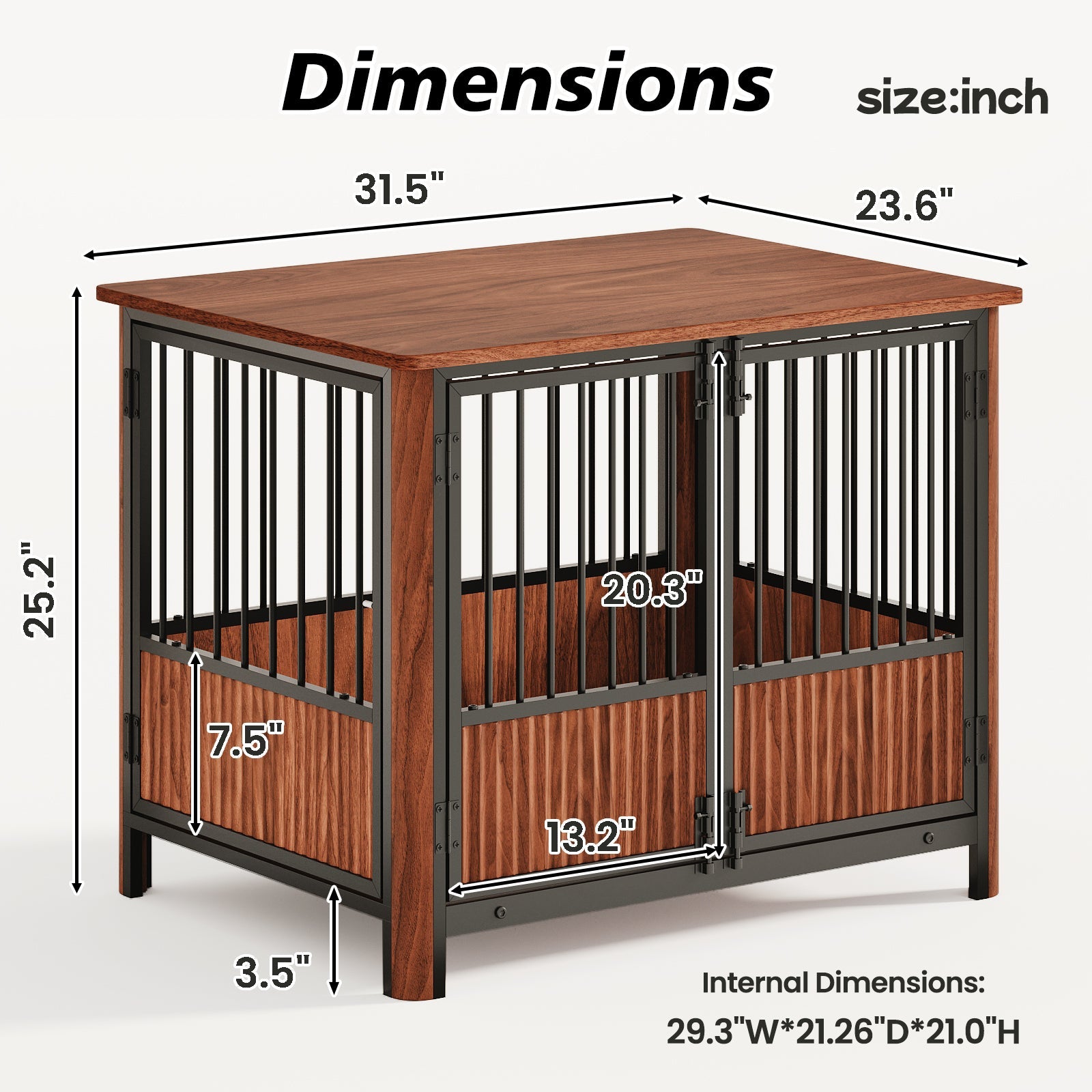 31.5'' Walnut Fluted Wood Furniture Style Dog Crate for small & Medium Dogs - Double Door Design, Decorative Pet House & Indoor Side End Table.