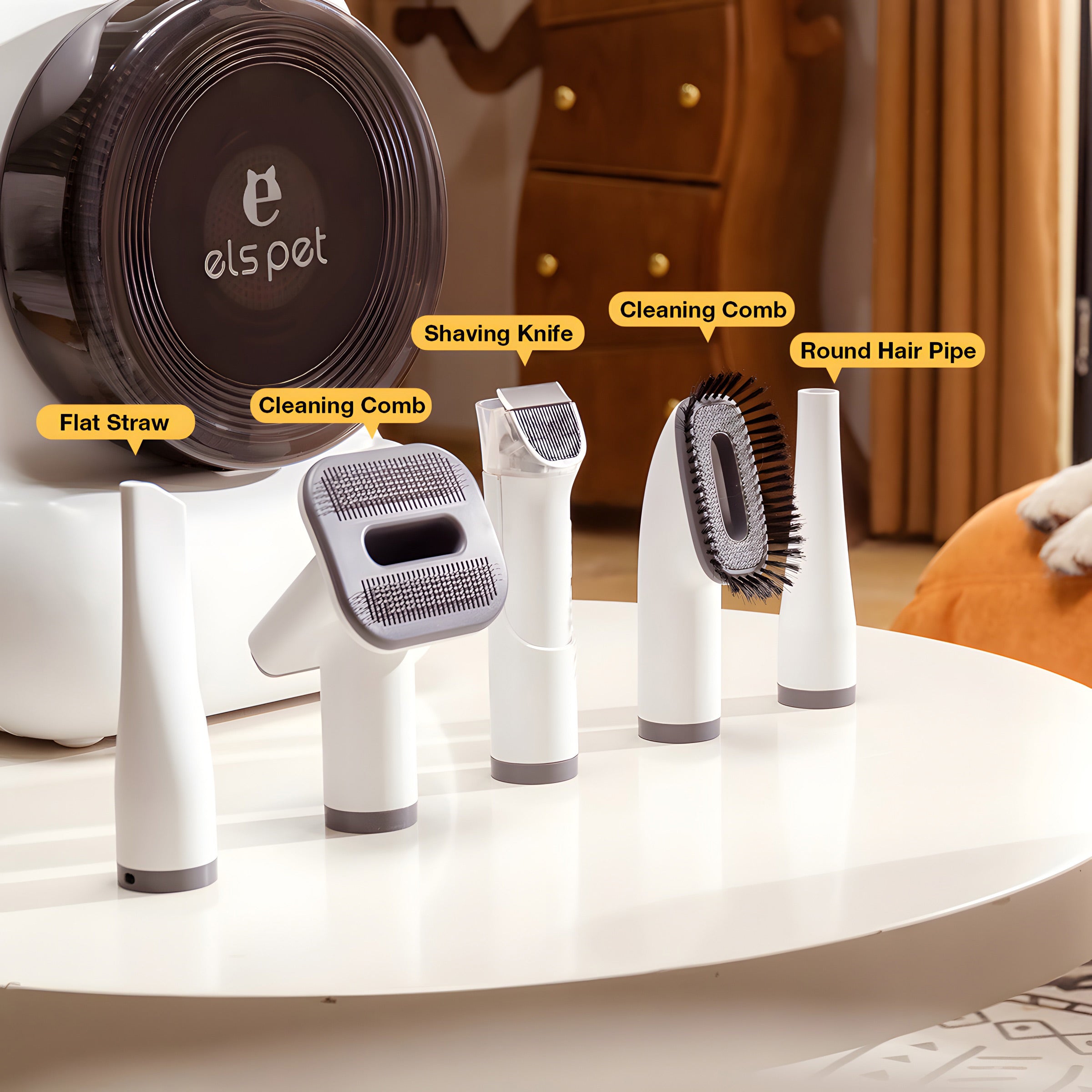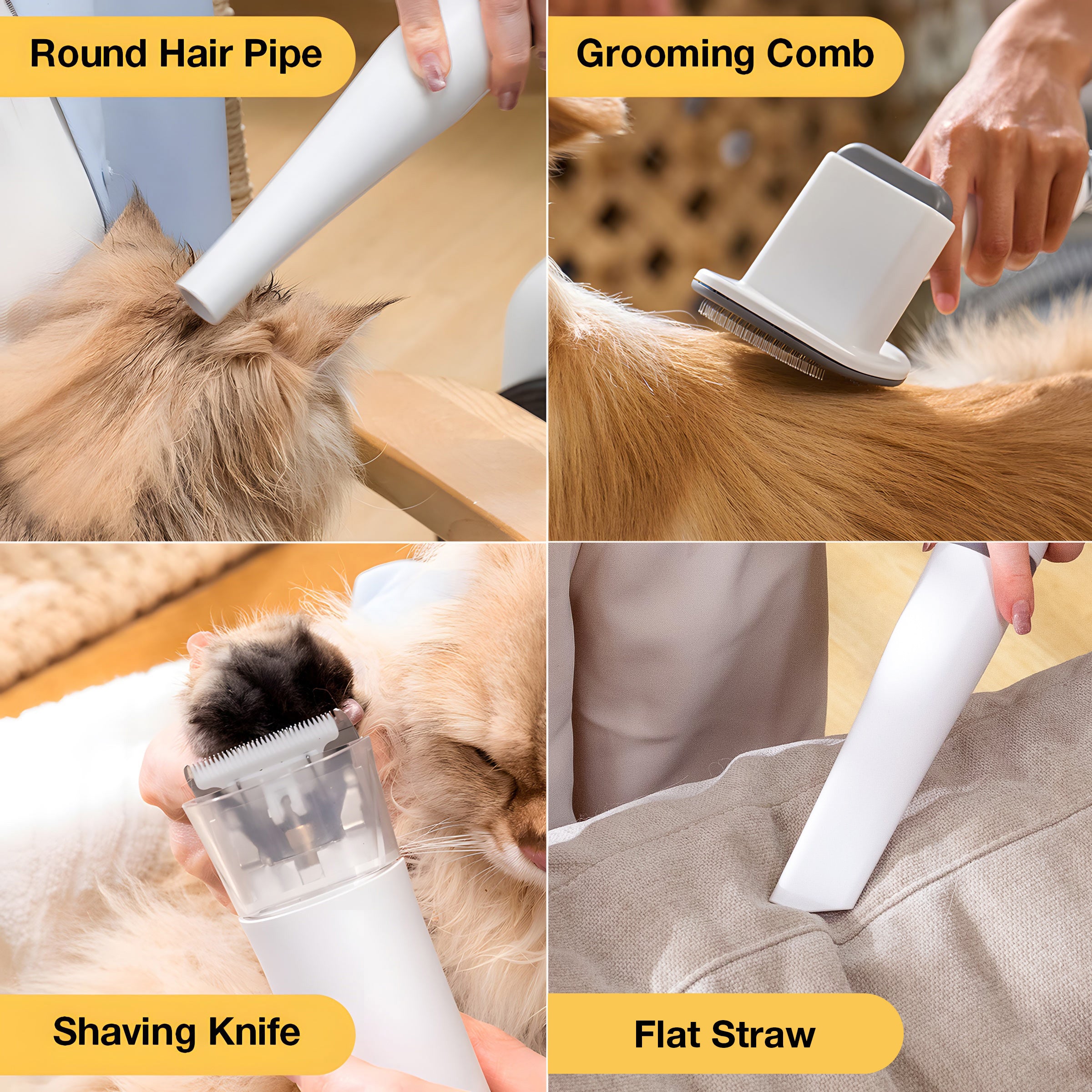 Whoa! Amazing and everything I need all in one place. I have 3 long hair cats. Yep, hair everywhere. Along the floor edges, floating in the air after they run and tumble around together, on my bed where they sleep, on my clothing (black and white cats, there is no great saving color for me), on my sofa, the area rugs. When I shave them, hair on my arms, face and in my nose. BUT, not anymore. And I'm being serious. I got my grooming kit and went about shaving all 3 (one sits and waits for me to finish!). Best shave ever - no hair on me, the floor or floating around me. Having the unit suck the hair up as I'm shaving is beyond amazing. I can clean the area immediately after if anything lingers with another attachment. I can clean the bed with this and not have to collect all the hair to throw. It's enough to outfit another cat. Major doesn't care about the motor sound, he was more curious about the air flow at the end. General doesn't like the sound of the motor even on low but he has never loved getting shaved. He doesn't mind the clippers noise as much. I have to hold him down so having the hair sucked into the machine right away is so helpful for him not escaping through the bundle and dispersing it into the air during his exit. Tin Tin (Captain) is new to getting shaved so first run was short but okay. She doesn't love the motor sound either but she may get used to it. I've had this only a couple weeks and I still can't believe you've come up with an all inclusive machine that actually works.